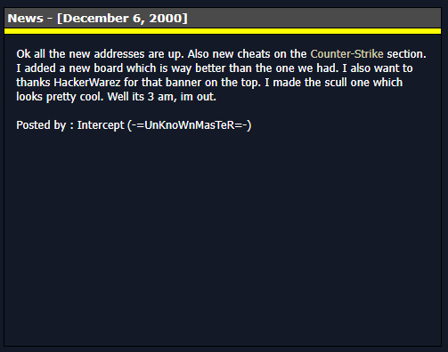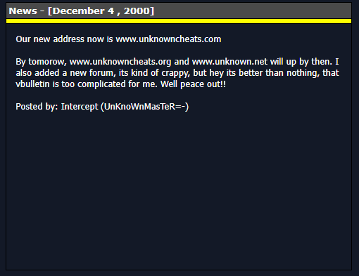 Some of the oldest communities are still around today. Unknowncheats started off as early as 2000 at Geocities. Here’s a glimpse of them back then.